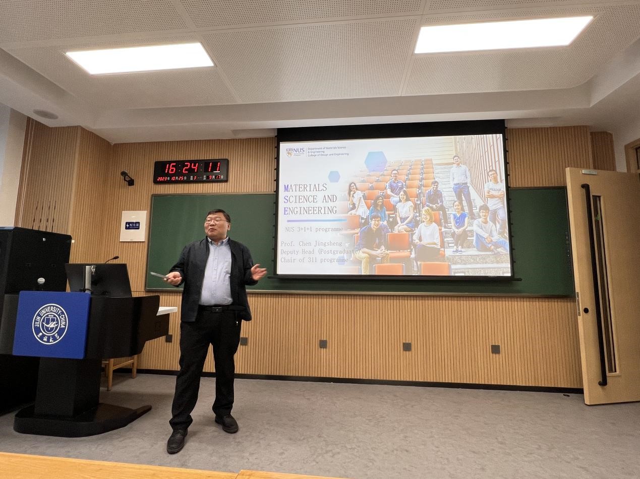与工程系教授、新国大苏州研究院和新国大重庆研究院首席研究员陈景升老师介绍并分享了自己的研究方向和科研心得,激发了同学们的科研兴趣。陈教授表示,留学的经历可以成为人生中难得的财富,不仅可以提升个人的学术水平和专业能力,还可以拓宽视野、增长见识。期待同学们赴新加坡继续深造。