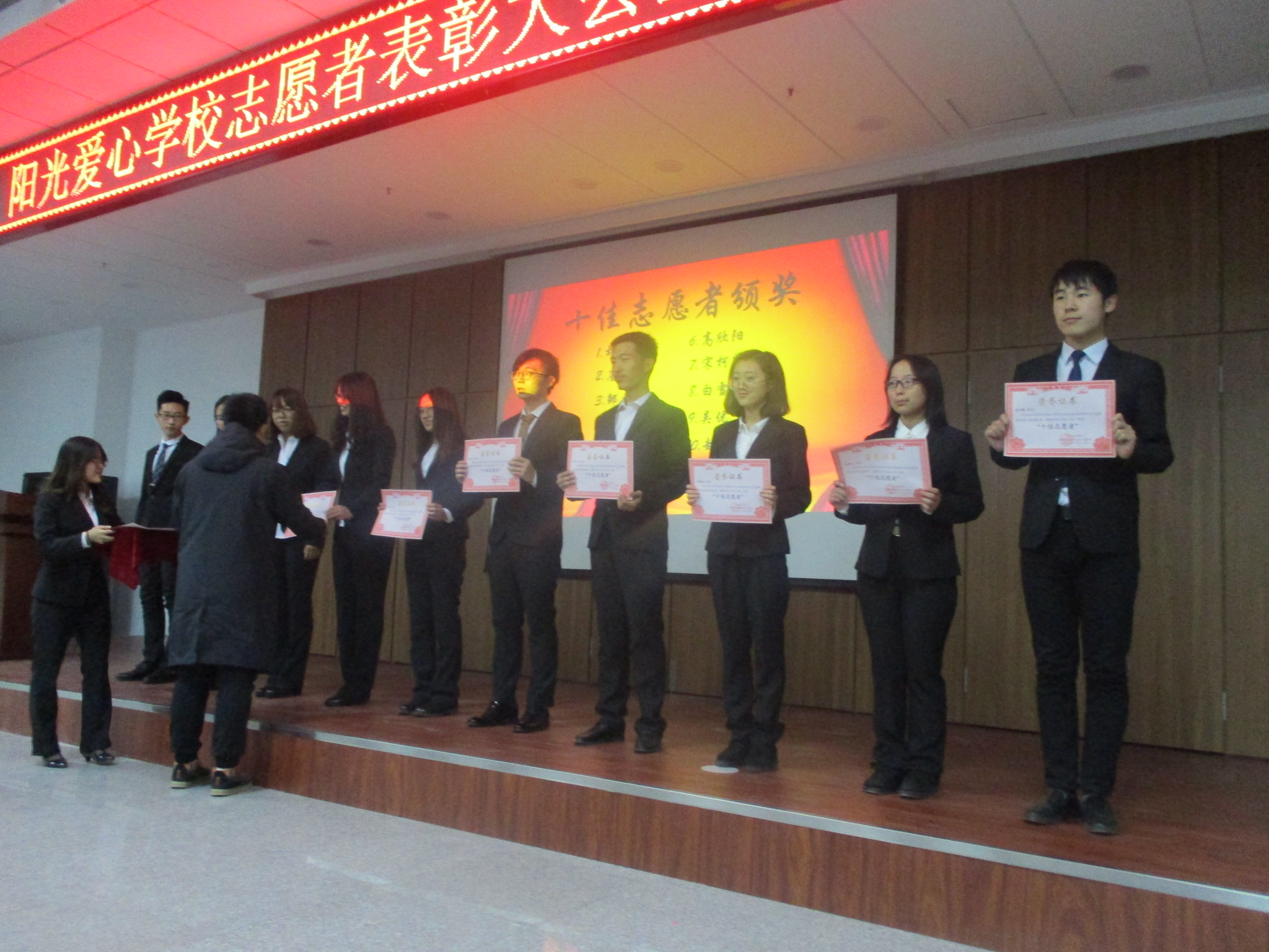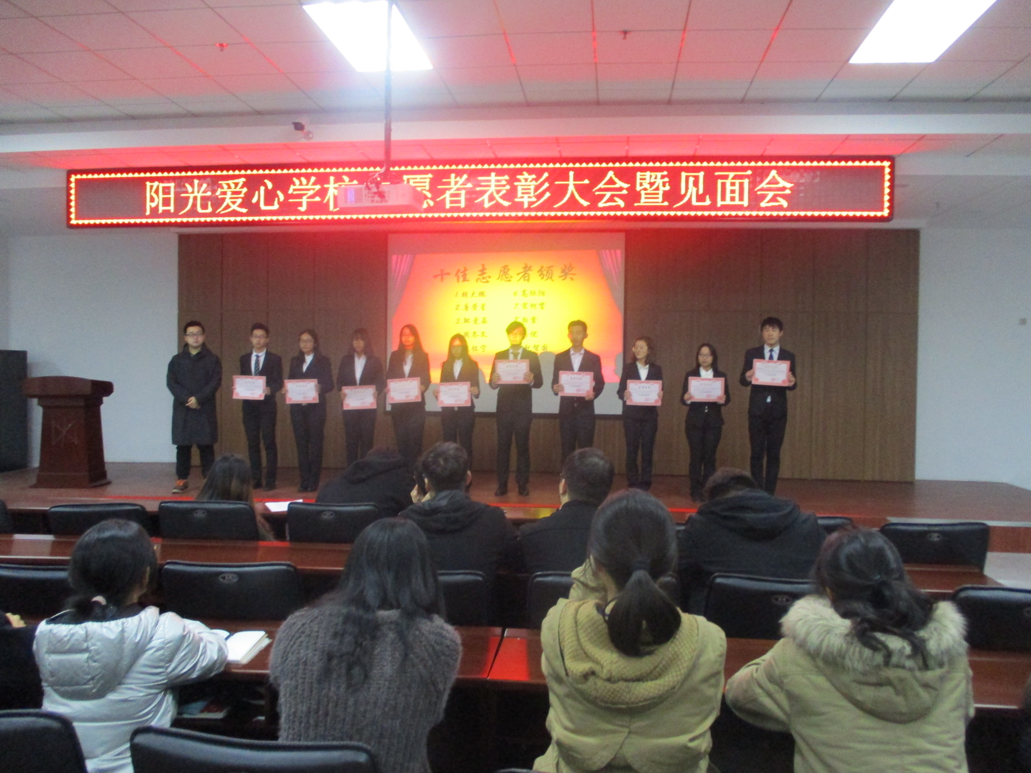 首先主持人通过《以梦为马》一诗拉开活动的序幕,紧接着社区基地、省博物馆基地、特殊教育基地、支教处基地负责人依次上台发言,和大家分享他们过去一年的活动感悟,然后由阳光爱心学校副校长及秘书长为十佳志愿者和优秀志愿者颁奖,并由优秀志愿者陈怀宁代表发言,接着志工部部长滕宏带领志愿者们宣读志愿者誓词,最后由阳光爱心学校副校长许浩源以自身经历向志愿者们予以告诫和鼓励。颁奖结束后还设有游戏环节,意在活跃气氛、让志愿者们更加熟悉。晚8点,此次表彰大会暨见面会圆满结束!