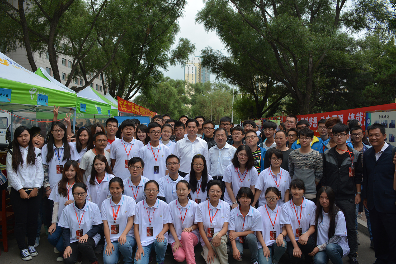 校领导一行人受到了15级新生和在场志愿者们的热烈欢迎。校领导首先询问了我院2015级辅导员滕亚廷迎新工作的开展情况,并与新生热切交谈,关切地询问新生家乡近况,是否能适应新的大学生活等问题,鼓励新生在大学里勤学慎思,踏实求是,并以“求实创新,励志图强”的校训寄托对新生的期望。校领导还亲切地问候了在场值班的志愿者们,赞扬志愿者们为学校做出的贡献,期望志愿者们展现出我们吉大学子优良的精神风貌,并同志愿者一一握手。志愿者们受到了极大的鼓舞,以更加饱满的热情投入工作。最后校领导与新生和全体志愿者合影留念,并嘱托志愿者们要认真做好迎新工作。