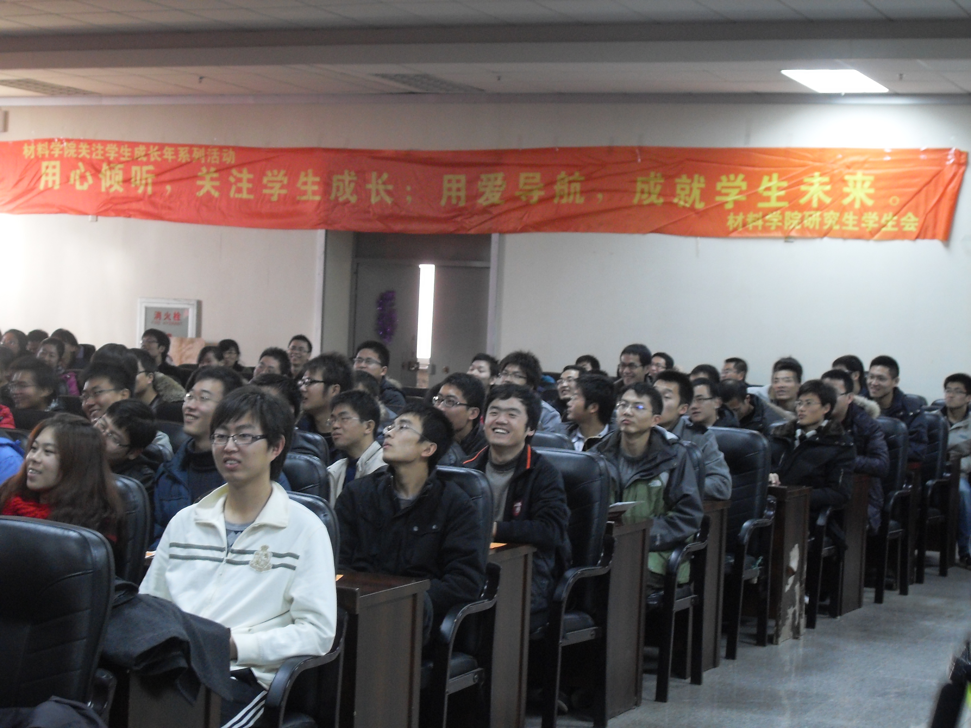2010年11月22日下午两点由材料学院研究生会主办“薪火相传,学海引航”优秀学子交流会在机械材料馆八楼会议室顺利召开,此次交流会主要面向研究生新生,希望通过优秀学子的经验传授,达到活跃学术氛围、扩大知识面、提高科研能力、真正达到“展示自我,促进交流”的目的。此次活动得到了学院领导的高度重视,尤其是主管研究生工作的于雅琳副书记要求研究生会全力做好此次活动,把学校“关注学生成长年”的精神落到实处,使研一新生能够规划自己的人生蓝图,树立正确的人生目标!