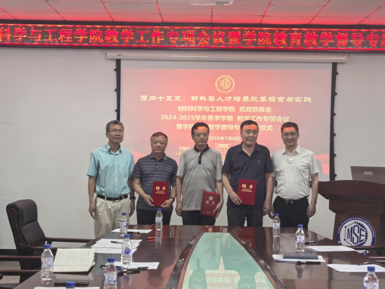 于机械材料馆410会议室召开党政联席会教学工作专项会议暨学院教育教学督导专家聘任仪式。会议以“面向十五五:材料类人才培养改革探索与实践”为主题,学院党政领导班子、学院教学委员会、教育教学督导专家共同就“十五五”期间学院人才培养、教学改革等问题进行了深入探讨。学院党委书记孙恒、院长张立军、全体领导班子、学院教学委员会主任李芳菲、学院教育教学督导专家出席会议。会议由本科教学副院长赵小辉主持。