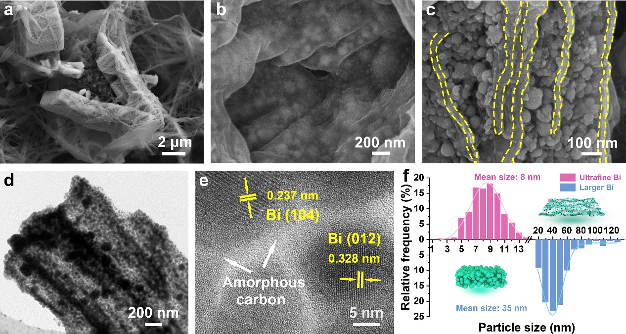 图1. Bi/N-CNSs复合材料的微观结构及其分级Bi分布特征