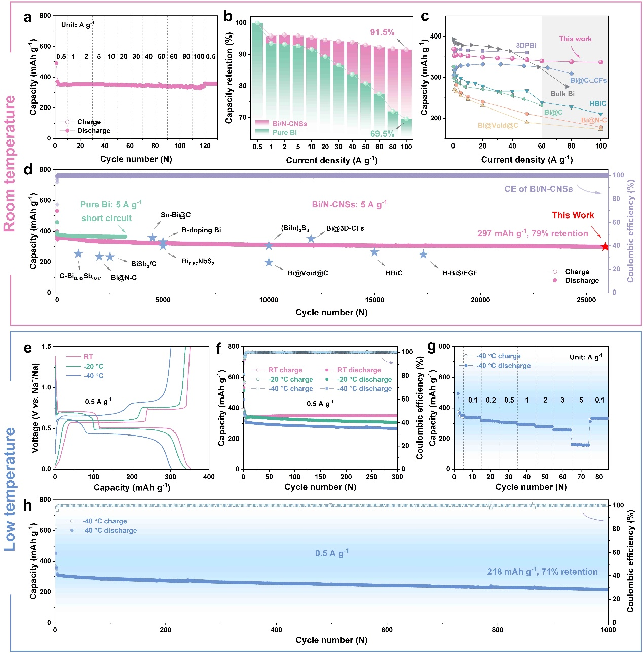 分级Bi分布(多孔Bi和超小Bi)缩短了离子输运距离,提高了高倍率下活性物质的利用率;“呼吸式”的类阵列结构构建了连续的导电和应力释放网络,确保了储钠稳定性。得益于上述优势,Bi/N-CNSs复合材料展现出优异的倍率性能(100 A g-1超大电流密度下的容量为337 mAh g-1,容量保留率高达91.5%)以及突出的循环稳定性(在5 A g-1电流密度下经过26000圈循环,可逆容量为297 mAh g-1)。此外,该复合材料还具有优异的低温耐受性。即便在-40 °C的恶劣工况下,Bi/N-CNSs仍可以实现稳定循环(0.5 A g-1电流密度下循环1000圈,容量保留率为71%)及高倍率充放电(5 A g-1大电流密度下的容量为161 mAh g-1)。