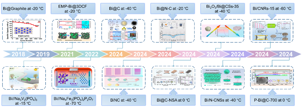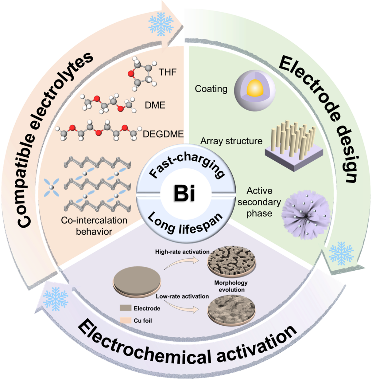 在能源存储需求日益增长的当下,低温环境下电动汽车的推广,以及极地与深海探测等特殊场景,均对电池的低温性能提出了更高要求。相比锂离子电池,钠离子电池因钠离子斯托克斯半径更小、去溶剂化能更低等本征优势,在宽温域适应性方面展现出巨大潜力。在众多负极材料中,铋基材料凭借储量丰富、环境友好、适中反应电位和高理论容量的优势脱颖而出。尤为关键的是,其在合金化过程中形成的高导电中间相、赝电容行为主导的快速电荷存储机制,以及醚基电解液诱导的结构自优化,共同构成了铋基负极在低温快充应用中的独特优势。