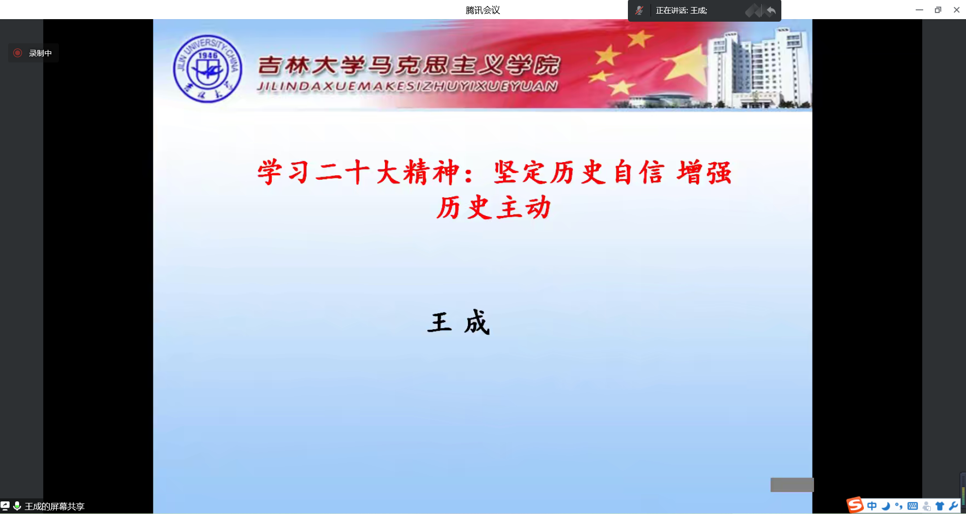 王成教授以《坚定历史自信 增强历史主动》为题,从三个方面对党的二十大报告进行系统梳理和深入阐释。第一方面,二十大报告相关内容简介,指出重大文本的历史意义一方面源于它的问题意识,一方面源于文本呈现出来的内容对问题意识的解答;第二方面,大历史观下二十大报告相关论断的重要意义,阐明二十大报告的重要性不仅仅是当下性的,其重要性要放置于大历史观的视野中才能充分彰显;第三方面,大历史观下如何继续深化学习二十大精神,强调大历史观可以为我们持续深入学习二十大报告提供遵循。