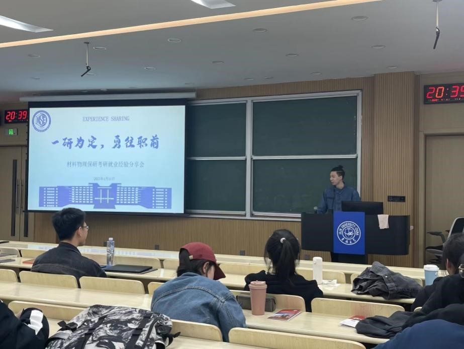 于2023年4月11日18时30分在中心校区逸夫教学楼第七阶梯举办 “一研为定,勇往职前”——材料物理保研考研就业经验分享会。本次分享会邀请材料物理2015级优秀毕业生白庆虎、2019级本科生杨艺琳、吕佳杰、胡涵威、单亦凡、唐棋、王耿璇、龙之雨进行经验分享,材料物理辅导员张晗禹老师、材料物理系全体本科生参会。