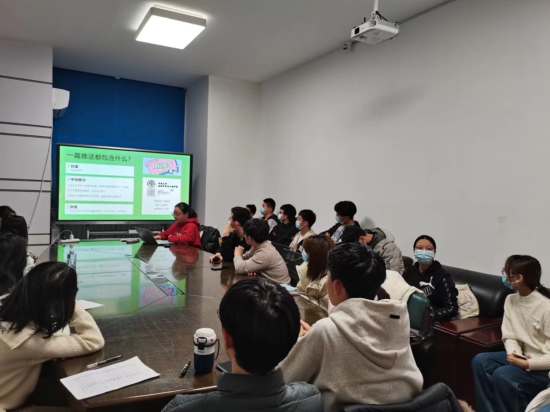 会议伊始,辅导员张晗禹老师从自身经历出发和同学们交流工作经验,阐述了学生工作的意义,并表达了对新一届团学组织成员们的殷切期望。接下来,学生会工作人员陈敏嫣同学以幽默的口吻和通俗易懂的表达方式,向大家介绍了推送排版流程及推送封面的制作方法,同学们反馈良好,气氛活跃。学生会轮值主席赵婷婷同学向同学们强调了在制作推送过程中应该注意的文案写作规范以及排版形式等问题,并进一步明确了推送制作的要求和规范。学院基层团委副书记李雪扬同学讲解了活动举办的流程和策划案的写作方法,并向同学们推荐了相关工具性网站。最后,赵婷婷同学对本次培训会进行了总结性发言,会议圆满结束。