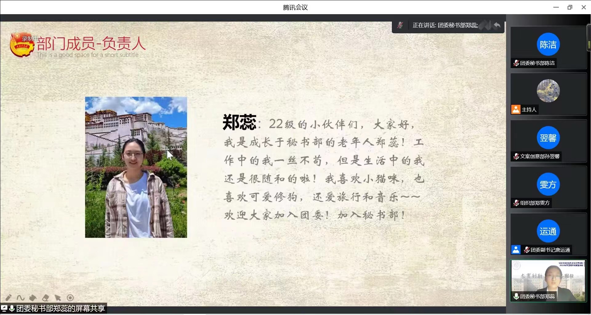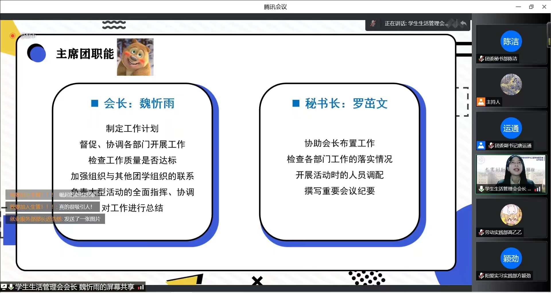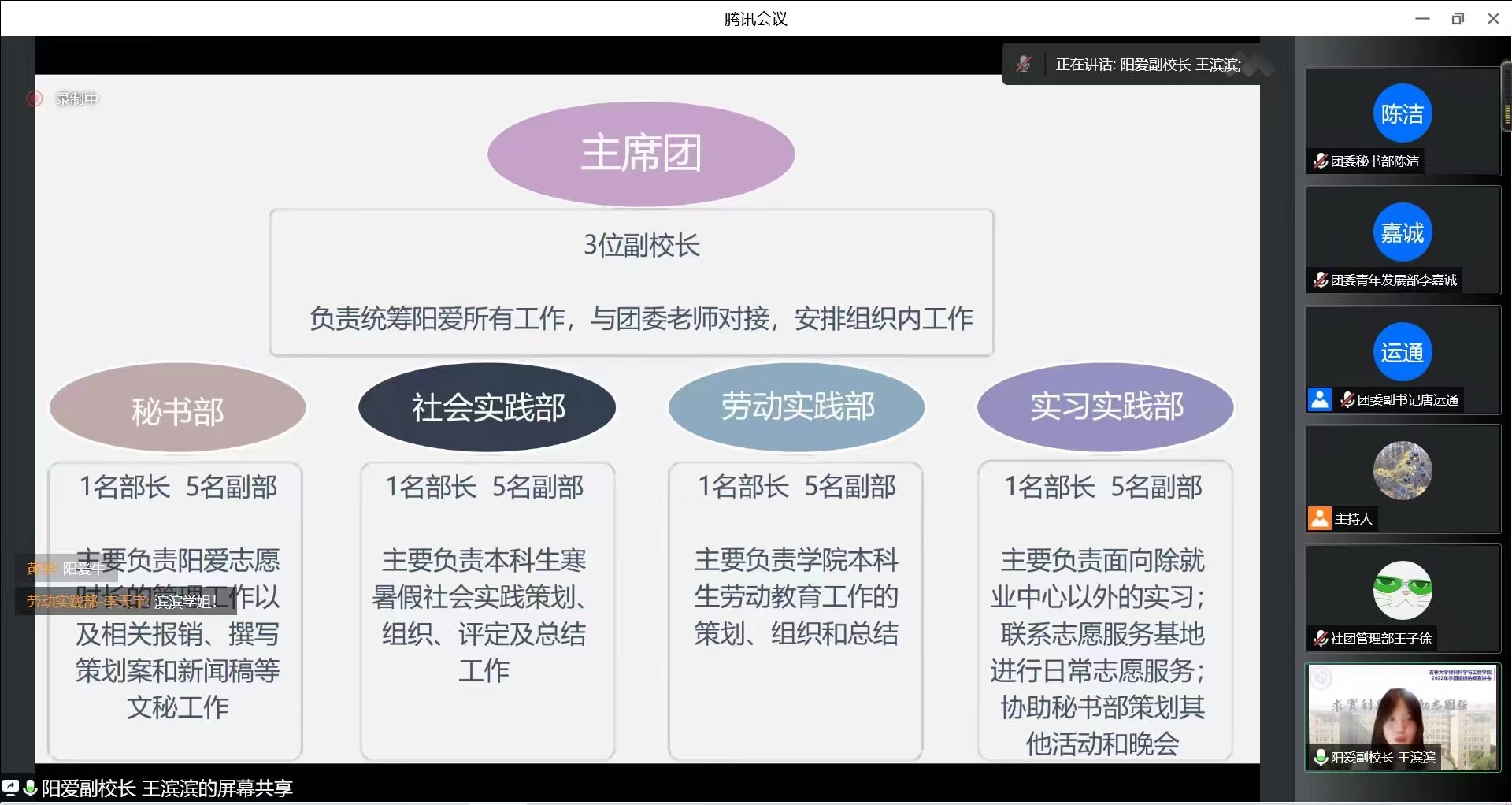 宣讲伊始,各组织以视频的方式介绍了工作职能与内容。接下来由各位宣讲人分别从学团组织各部门工作方向、部门信息、部门宗旨、承接工作等方面展开介绍,并且表示热烈欢迎2022级同学们的加入。本次宣讲会使同学们对学院学团组织有了更加全面深入的了解,也激发了同学们参与到学团组织工作中的热情。