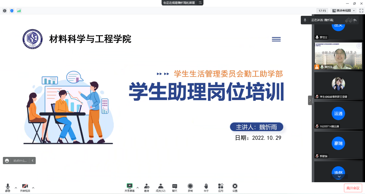 本次会议于腾讯会议线上进行,魏忻雨同学首先向大家说明了学生助理的工作要求,接着具体介绍了学生助理的工作内容,并详细列出了工作流程。作为学生助理,除了协助老师们完成相关学业工作,日常工作如浇花、拖地等也要放在心上,共同维持办公环境的整洁有序。
