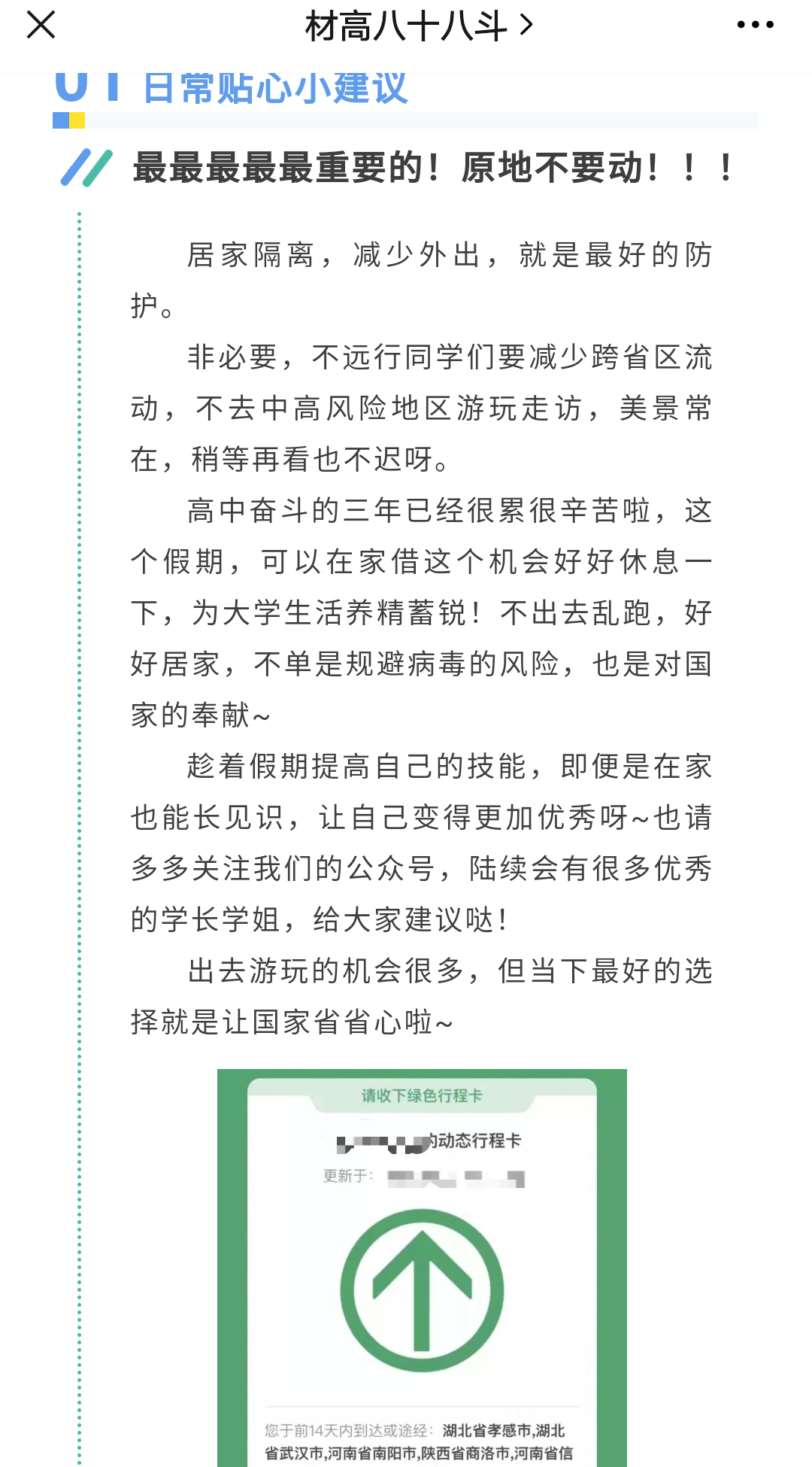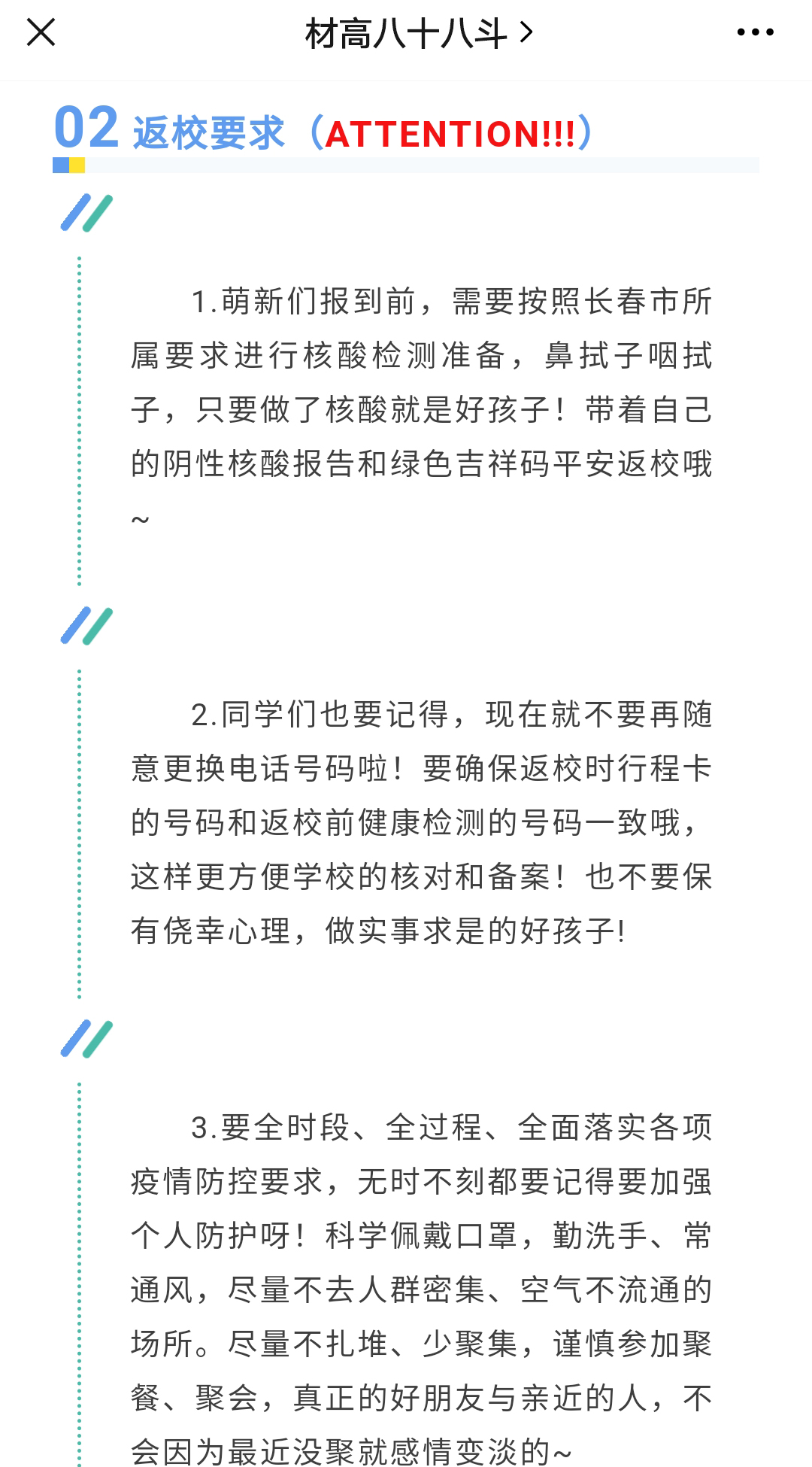 本次疫情防控教育通过微信推送的形式进行,着重强调了非必要不外出,保持社交安全距离、接种疫苗、保持个人卫生等对于开学前防疫工作的重要性。在介绍讲解的字里行间展现了学院对新同学们的期盼和爱护。