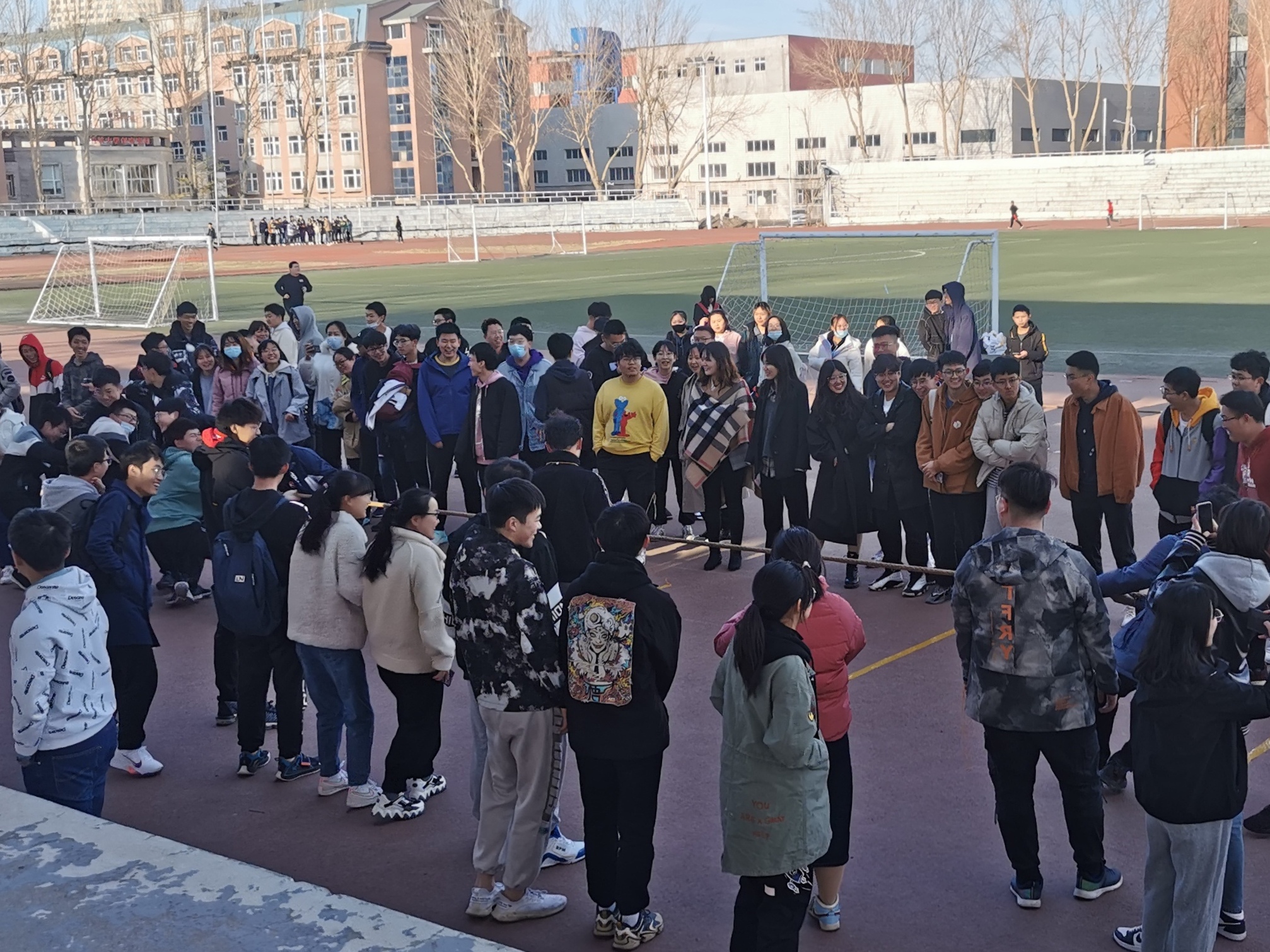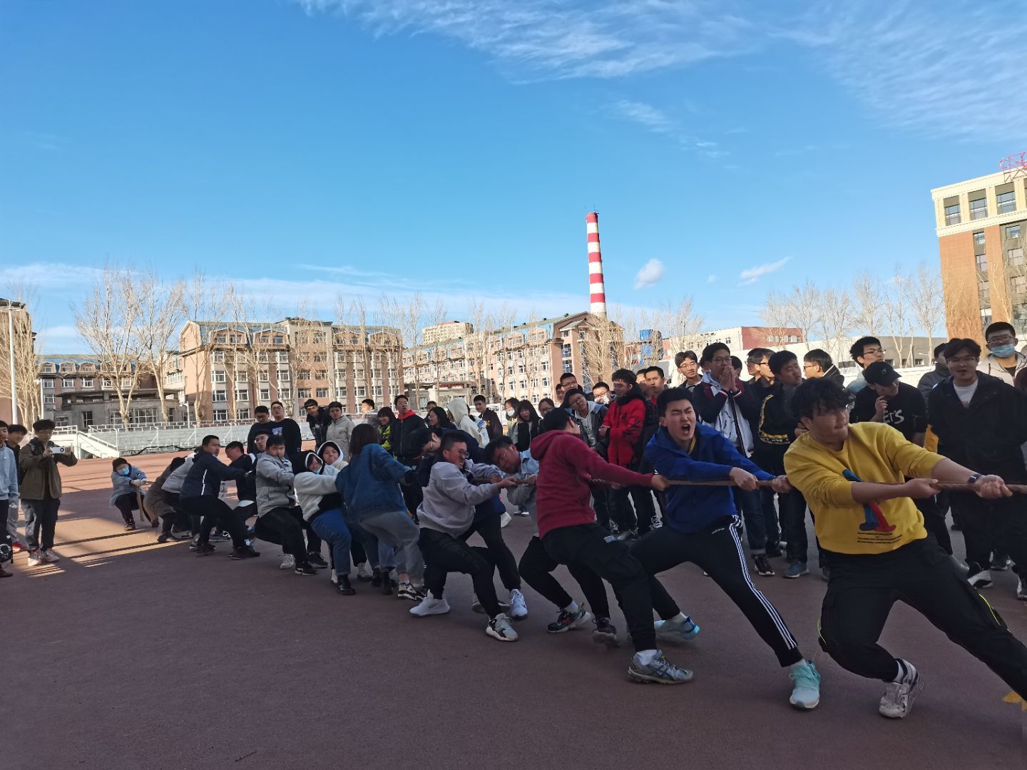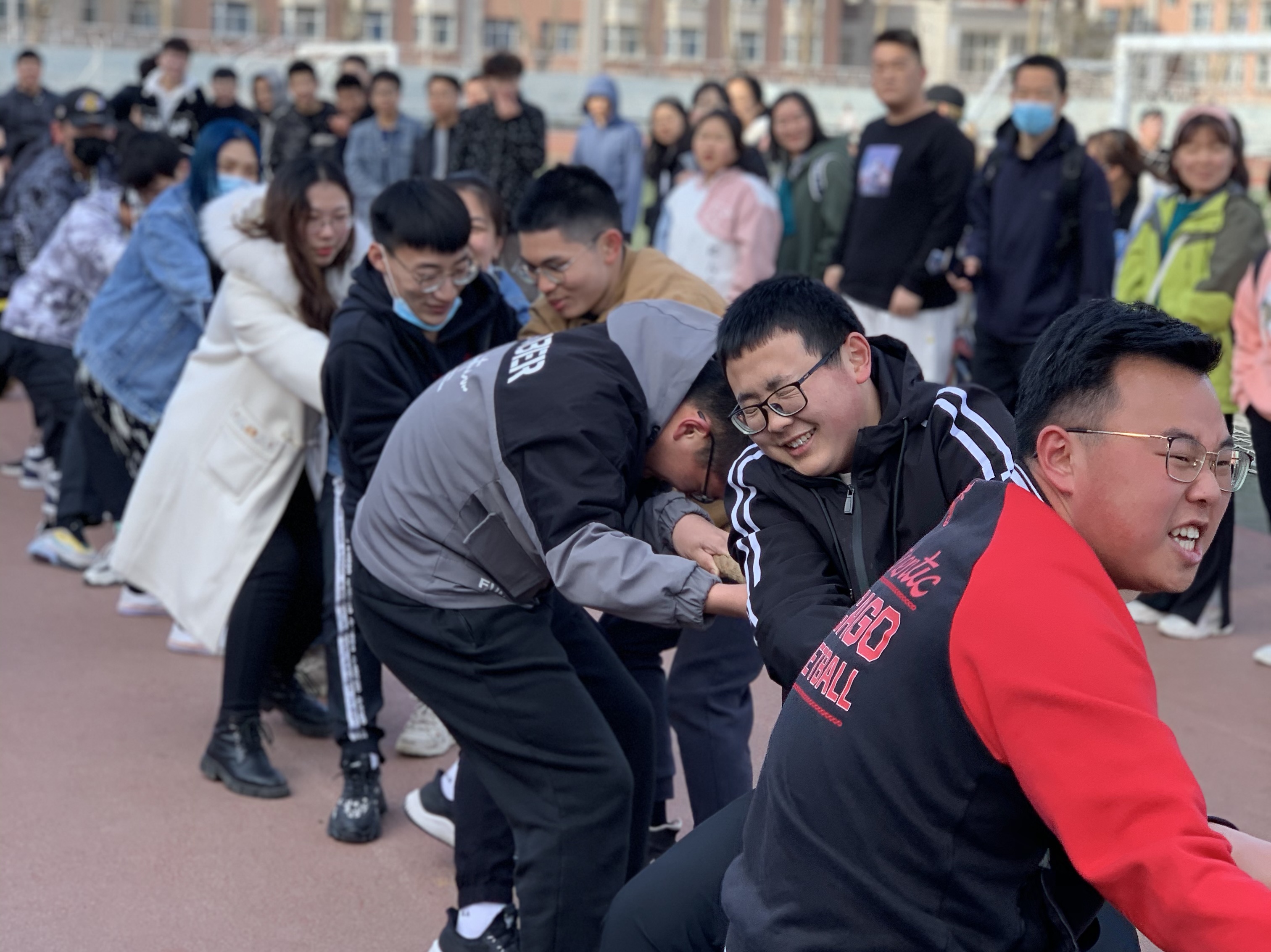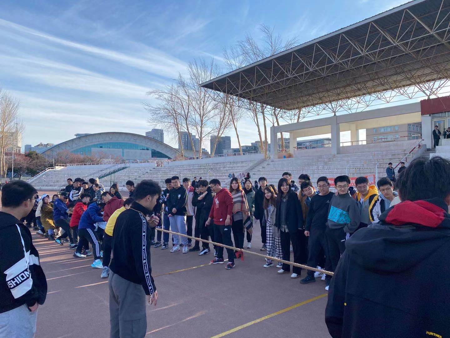 比赛开始前,2020级材料类专业各班班长提前到达比赛场地进行抽签决定比赛顺序及对手班级。参赛同学全部到场之后,在校园文化部成员的组织下,比赛班级有序地在绳的两端排好队形,三声短哨,一声长哨,双方同时发力,那一刻,同学们都竭尽全力,没有上场的同学同样情绪激昂。一时间,操场上热闹非凡。