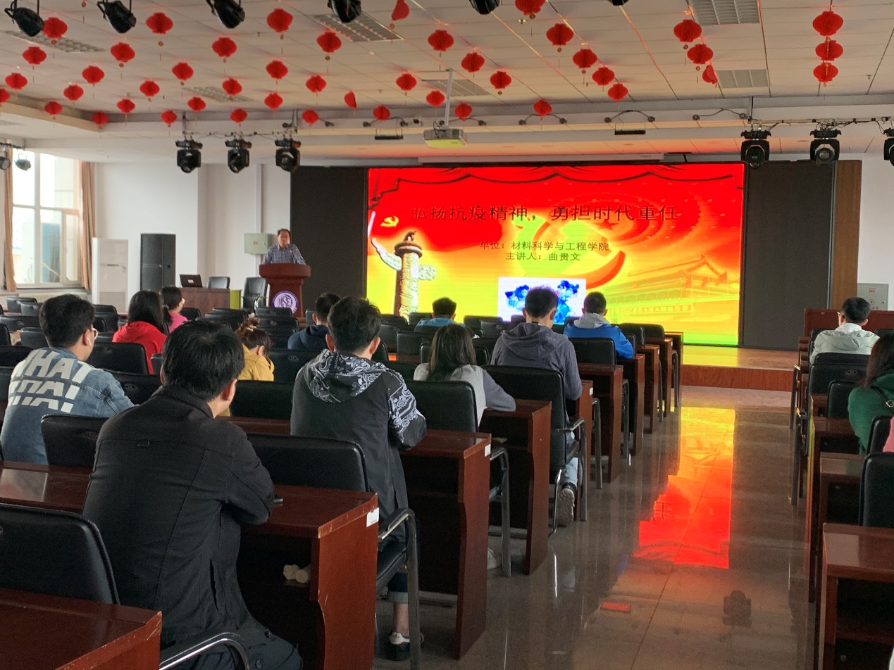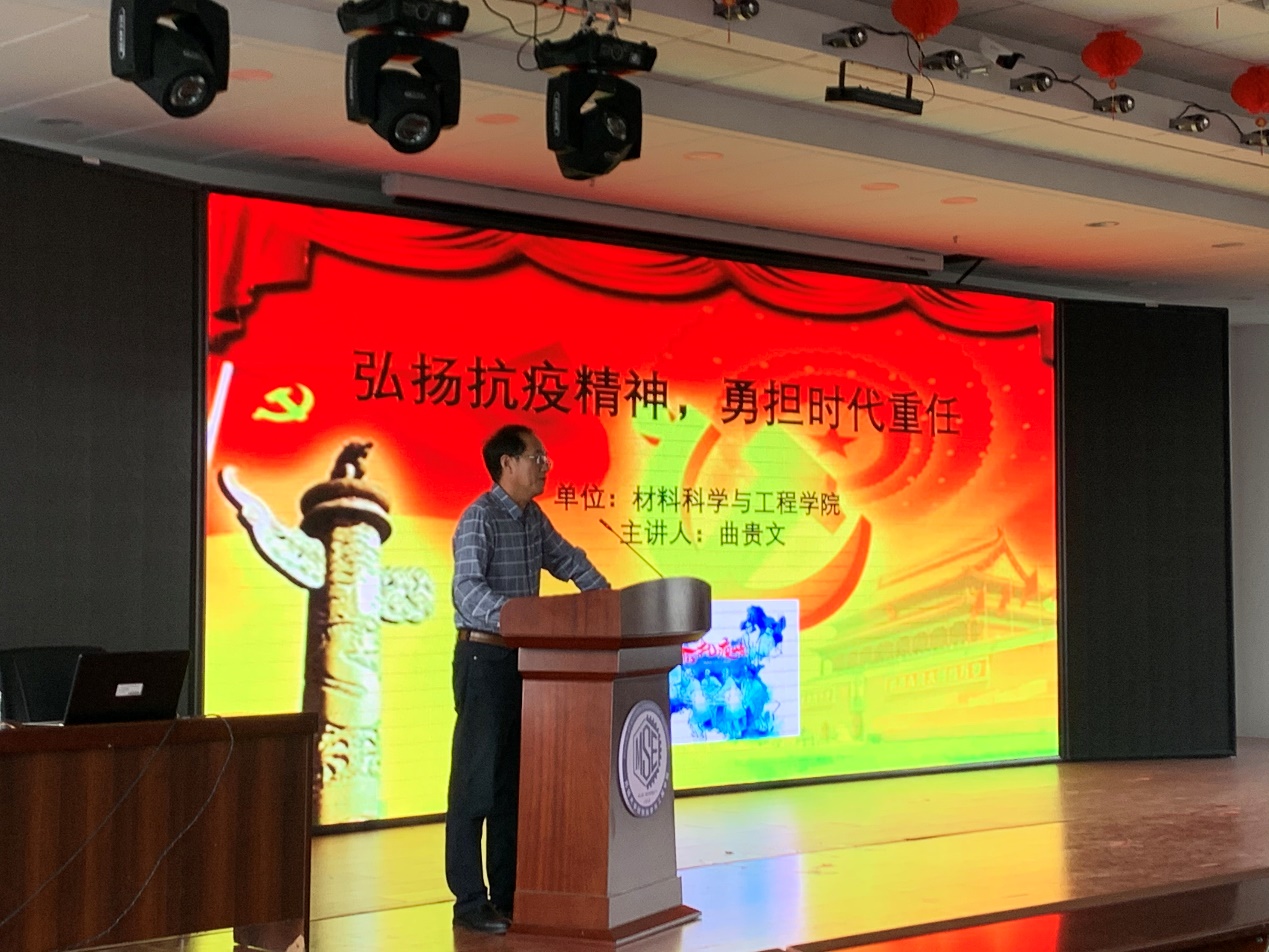 2020年9月22日9:00时,在材料管八楼会议室,学院党委副书记曲贵文以“弘扬抗疫精神,勇担时代重任”为题,为2019级硕士研究生党支部及2019级博士研究生党支部开展了一次党课活动。