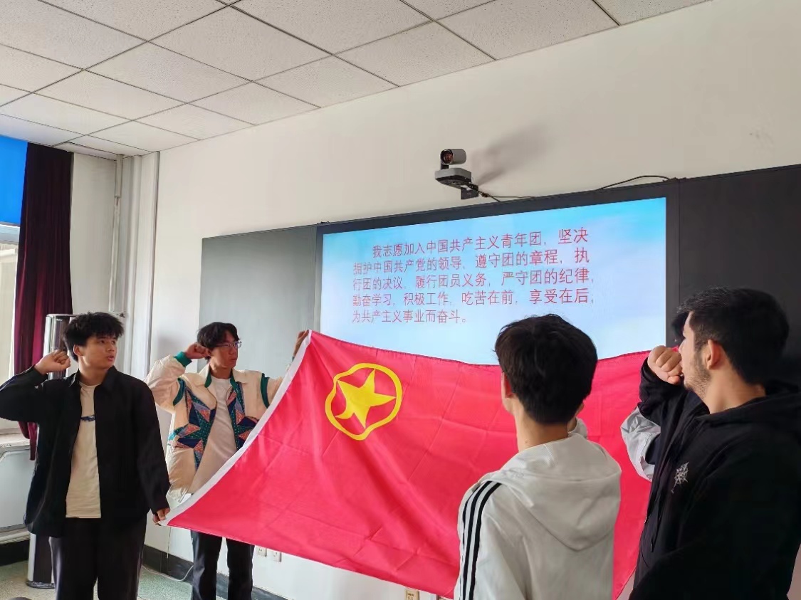 随后,在场全体团员起立,面对庄严的团旗,在团干部的带领下,高举右拳,再一次齐声宣誓:“我志愿加入中国共产主义青年团,坚决拥护中国共产党的领导,遵守团的章程……”铿锵有力的誓言在会议室内回荡,彰显了新团员们对共青团组织的忠诚和对共产主义事业的坚定信仰。