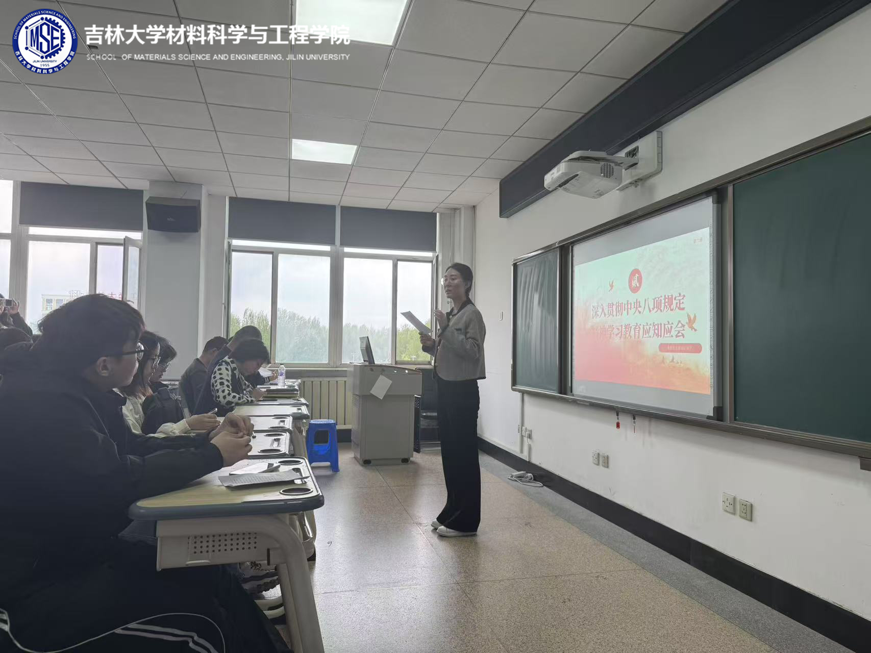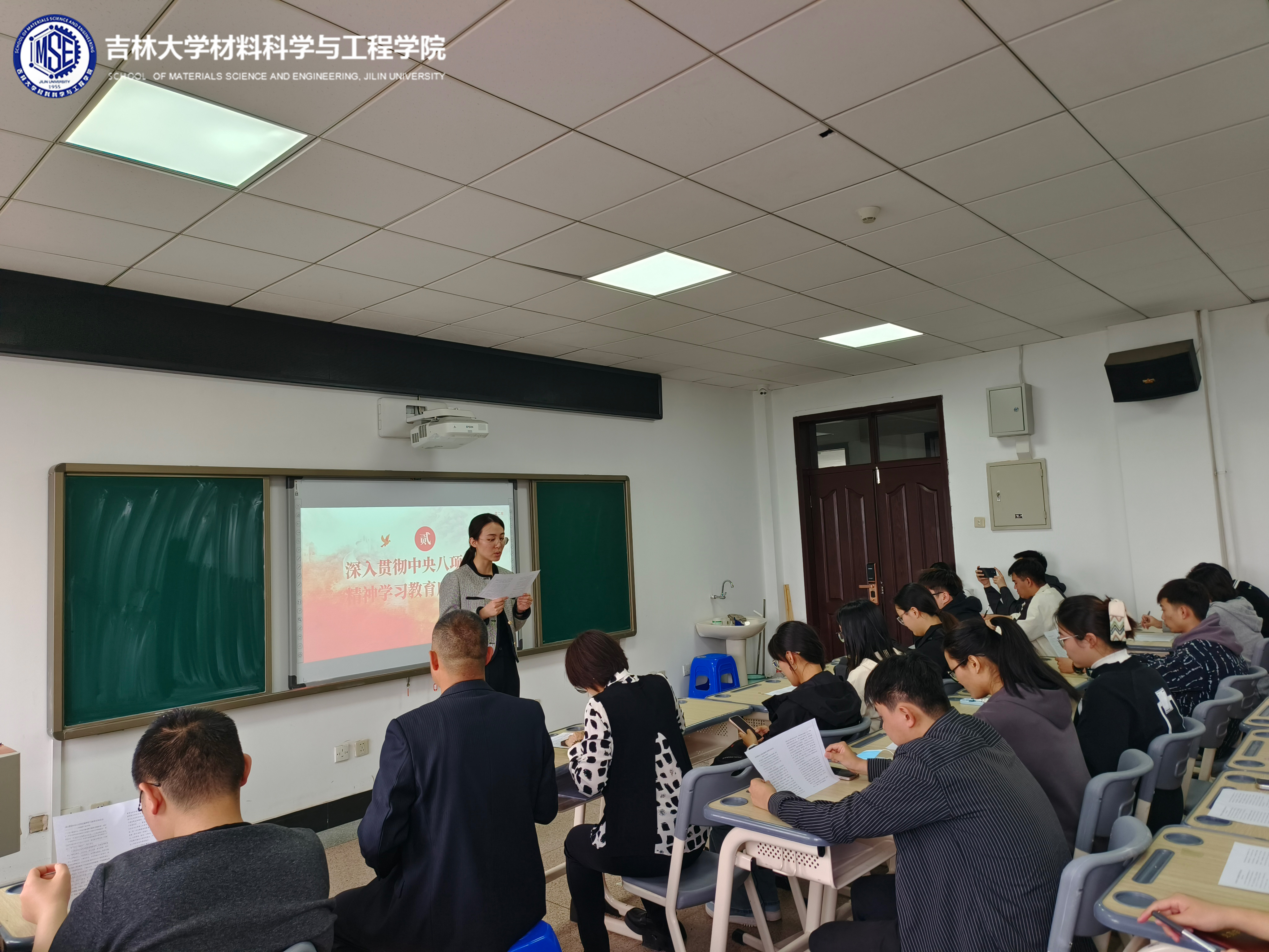 本科学生党支部举办深入贯彻中央八项规定精神学习教育主题党日活动。学院党委副书记华蕊老师、本科学生支部书记严冬老师、王晗老师、辅导员唐运通老师以及全体学生党员参与活动。