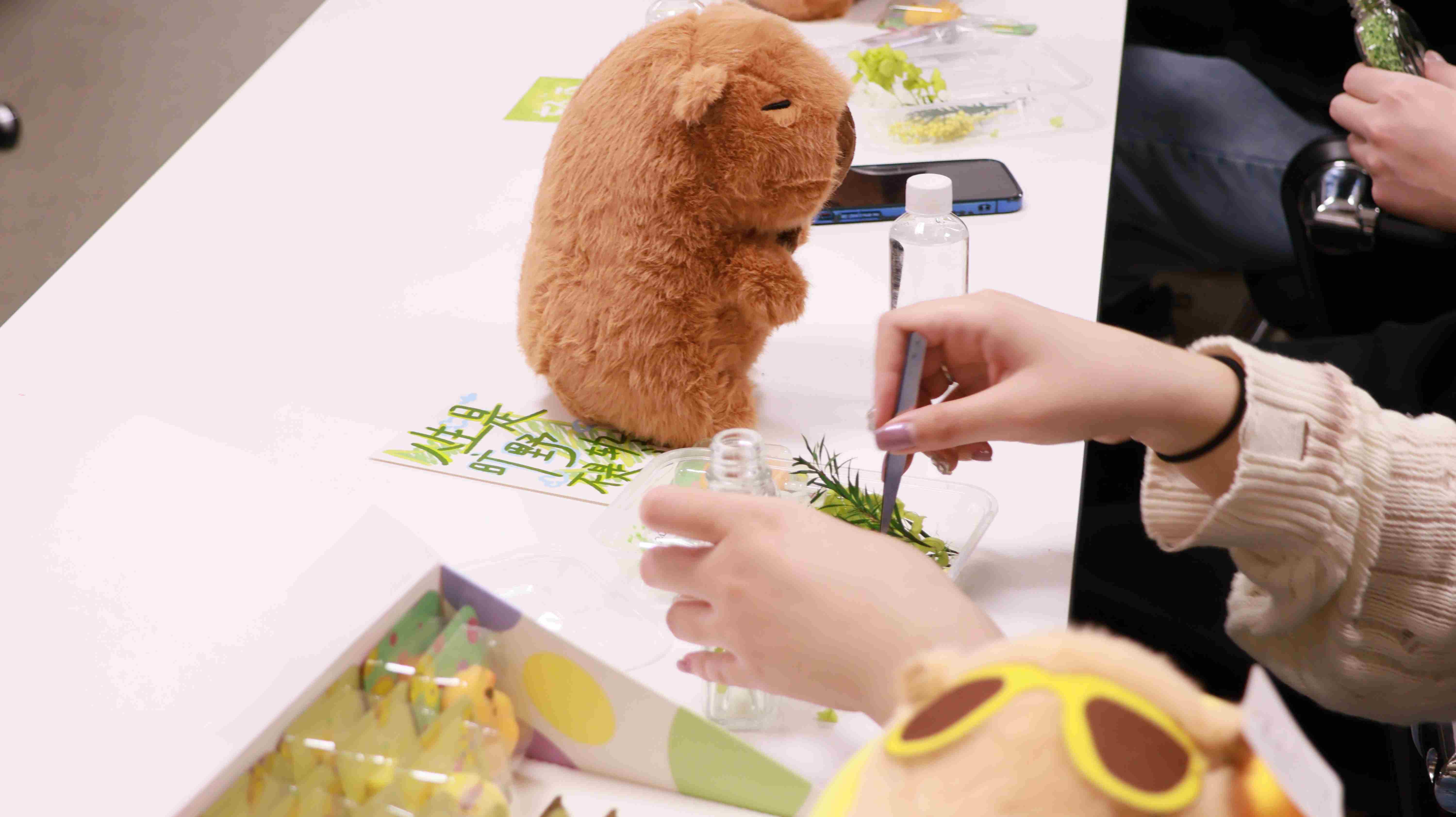 ·手作体验:同学们自由搭配干花与永生花(如向日葵、薰衣草等),通过色彩渐变与层次构建,创作独一无二的浮游花瓶。矿物油的缓缓注入象征着时间的凝固,引导参与者专注当下,体验心流状态。瓶中故事会·情感共鸣:作品完成后以匿名漂流形式互相传递,参与者解读他人作品的情感隐喻并写下“读到的情绪”,随后分享创作初衷与留言感悟,共同探讨艺术表达与潜意识的内在联结。封瓶仪式·定格美好:每位参与者在丝带上写下对自己的祝福,系于瓶口,完成 “封存烦恼,留存美好” 的仪式,活动最后以集体合影落下帷幕,记录下 “情绪可见” 的温暖瞬间。