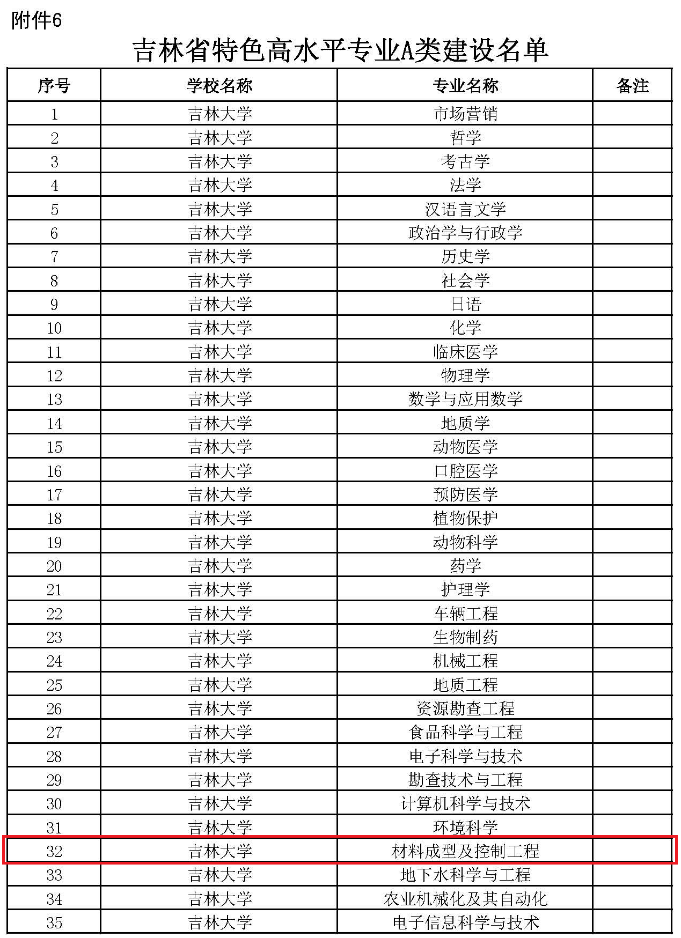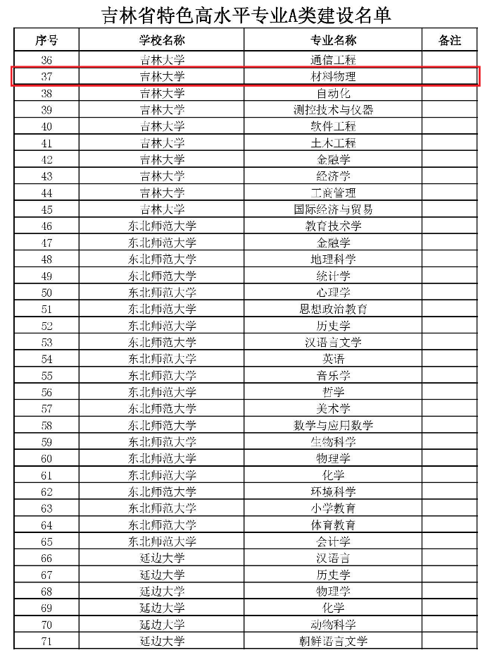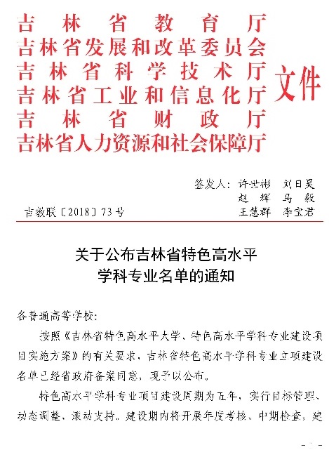 5-6. 吉林省特色高水平专业A类建设:材料成型及控制工程、材料物理,吉林省教育厅、吉林省发展和改革委员会、吉林省科学技术厅、吉林省工业和信息化厅、吉林省财政厅、吉林省人力资源和社会保障厅,2018.12.29